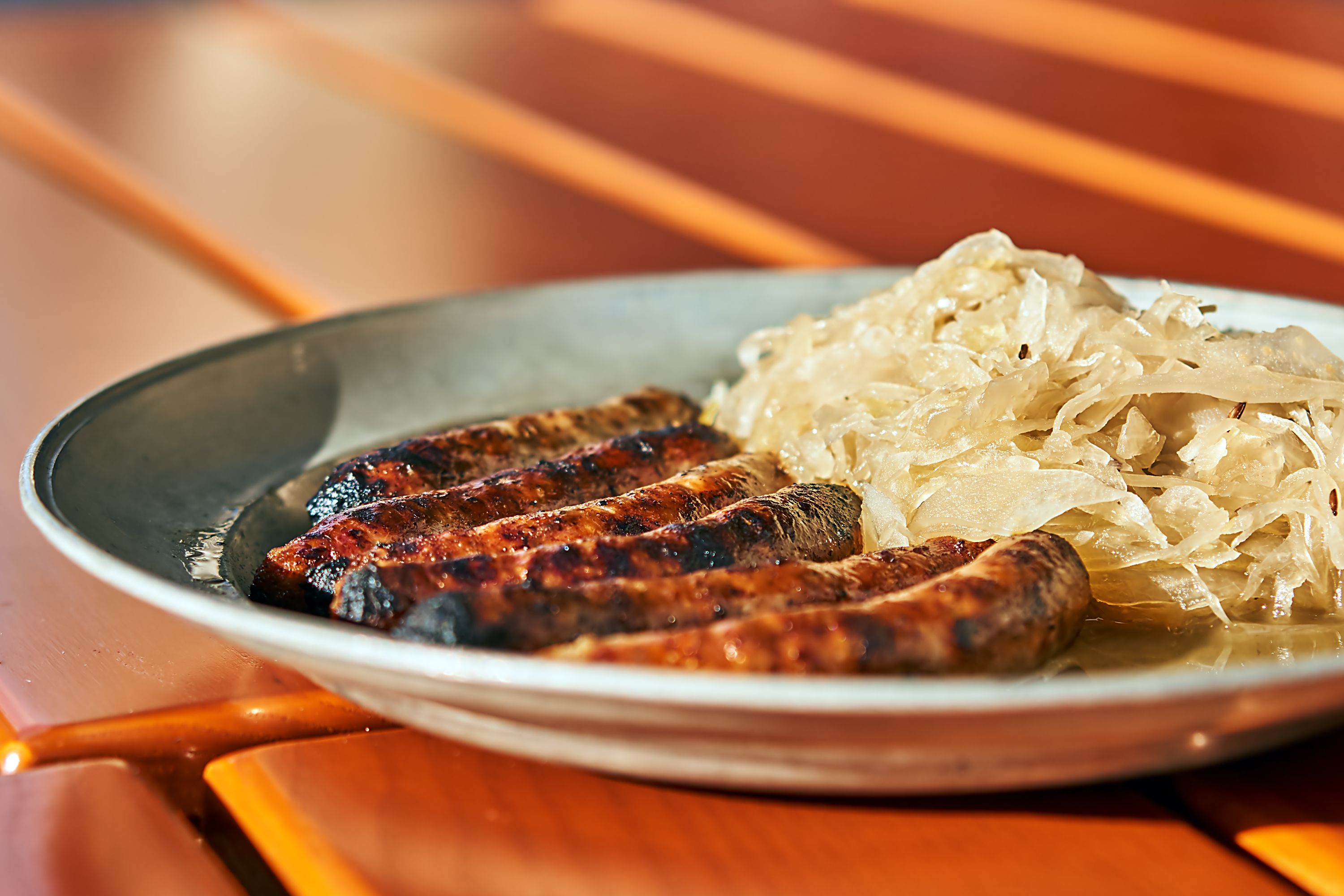 In einem traditionellen Bratwurst-Restaurant in Nürnberg herrscht eine gemütlich-urige Atmosphäre: Holztische, historische Dekorationen – und natürlich liegt immer der Duft von gegrillten Bratwürsten, Sauerkraut und Bier in der Luft.
