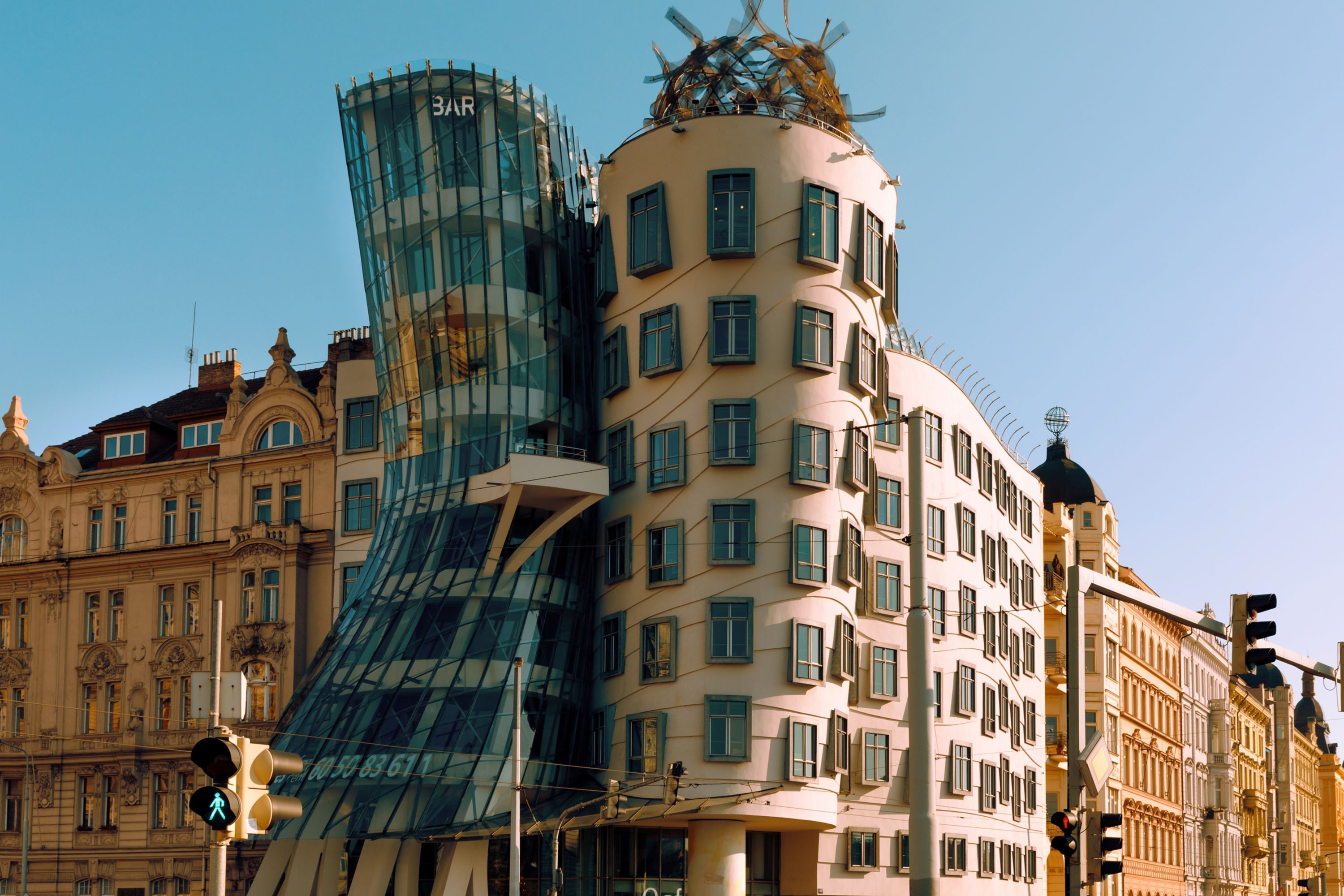 In der Rašínovo nábřeží Nr. 80 muss man zweimal hinschauen: Die geschwungenen Linien der Fassade sollen an eine tanzende Frau erinnern, die sich an einen Mann mit Hut schmiegt. Zugegeben, ein wenig Fantasie und der richtige Winkel gehören dazu. Lässt man sich jedoch darauf ein, ist das Paar durchaus zu erkennen. Mit entworfen hat das Tanzende Haus (Tančící dům) der weltberühmte Architekt Frank Gehry Mitte der 1990er-Jahre. Das Gebäude wurde zu einem Symbol der Moderne und Hoffnung der damals noch jungen Demokratie. Zu einer der bekanntesten Sehenswürdigkeiten Prags ist das Tanzende Haus aber auch durch Instagram geworden. Wegen seiner Form nennen die Prager das Gebäude auch „Ginger und Fred“ nach dem legendären Tanzpaar Ginger Rogers und Fred Astaire.