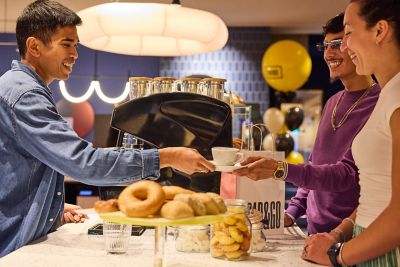 TRIBE’s guest rooms are all about simplicity, efficiency and cosiness – and we think they’re spot on! Our luxurious TRIBE Max room is on the 9th floor, with views over city-centre skyscrapers. Its striking design incorporates the restful deep blue of the hotel exterior, with a vividly patterned rug, ornamental mirror and statement headboard. On our first night, we slip on comfy dressing gowns and cosy up to watch our favourite show on catch-up TV. We sleep fantastically well under crisp white linens in our signature TRIBE queen-size bed, and waking up in the morning to freshly made Nespresso coffee is a sheer pleasure.