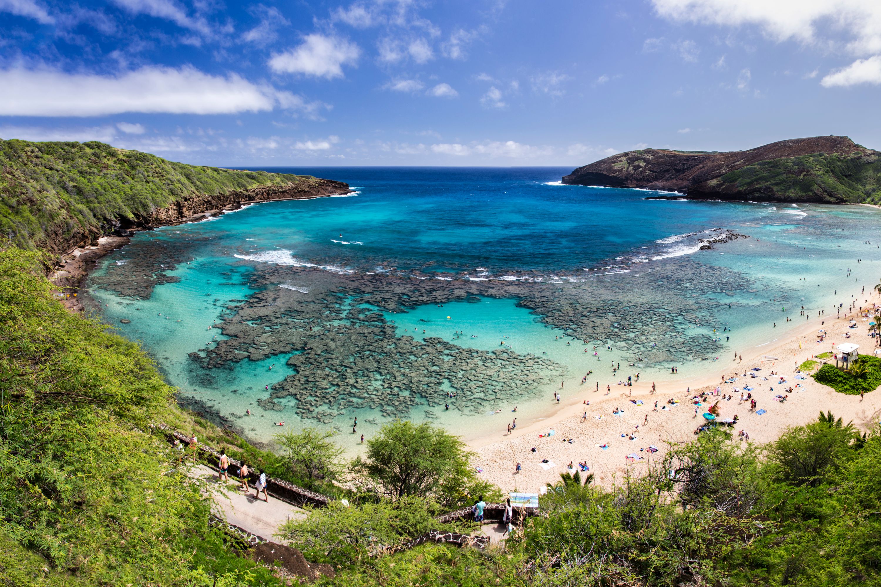 Tucked inside a volcanic crater along Oahu’s southeastern coast, Hanauma Bay is a living sanctuary where vibrant marine life thrives beneath turquoise waters. Renowned as one of Hawaii’s top snorkeling destinations, this protected bay invites visitors of all ages to glide above coral reefs teeming with tropical fish and sea turtles. Conservation is at the heart of the experience, as the access is limited daily and a short educational video is required before entry to help preserve the delicate ecosystem. It’s more than just a beautiful place to swim, it’s an opportunity to connect with nature in one of the island’s most awe-inspiring settings.