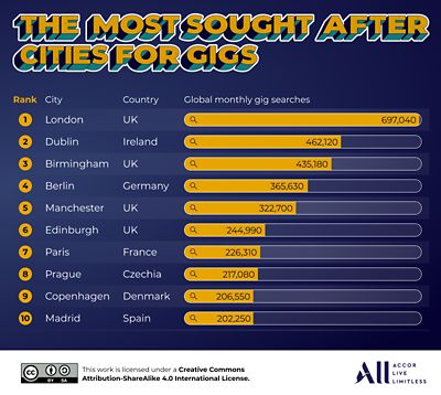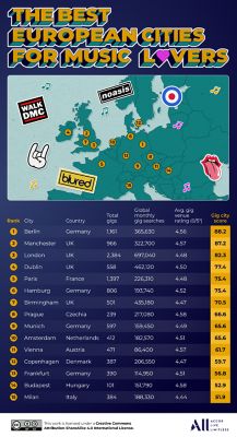 Concluding the top five destinations for live music is Paris, earning an overall gig city score of 75.43. The French capital boasts 1,397 live gigs and attracts 226,310 global monthly gig searches from fans eager to see their favourite artists perform.