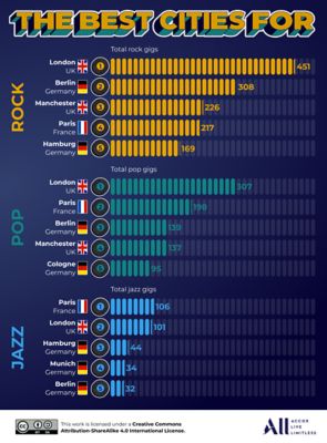 For this campaign, we analysed the top European cities for live music by collecting data from popular event and ticketing websites. We gathered the total number of available gig listings for each city in 2025, and broke them down by genre to identify which music styles were most popular in different locations. To determine the best overall cities for live gigs, we developed a weighted ranking based on three key factors: the number of events, search volume for gig-related keywords (sourced from KeywordTool.io, including similar searches for a comprehensive view of demand), and the average rating of top venues in each city, derived from Google Maps data. Each factor was given equal weight to create a final ranking, offering an objective measure of the best European cities for live music.