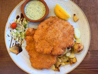 A true Wiener Schnitzel (literally “Viennese schnitzel”) is a wafer-thin slice of meat, covered in breadcrumbs and quickly fried to crisp, golden-brown perfection. Austrian law decrees that a genuine Wiener Schnitzel must be veal, and that alternatives must be labelled as such – lots of (great) schnitzel-chefs use pork: Wiener Schnitzel “vom Schwein”.
