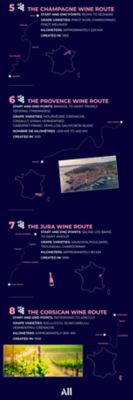 With multiple Provence wine tour itineraries available, this gorgeous route in the South of France takes you from the Mediterranean coast to the lavender fields and mountains of central Provence. Synonymous with colour and sunshine, the region produces diverse wines derived from Mourvèdre, Grenache, Cinsault, Syrah, Vermentino, Cabernet Franc, Sémillon and Sauvignon Blanc grapes. It’s France’s biggest producer of AOC (Appellation d'Origine Contrôlée) rosé, but also offers bold reds designed to complement Provence’s world-famous cuisine and fruity whites like those from Cassis, one of the oldest appellations in the country. Sights along the way include the Roman amphitheatre at Fréjus and Thoronet’s Cistercian abbey.