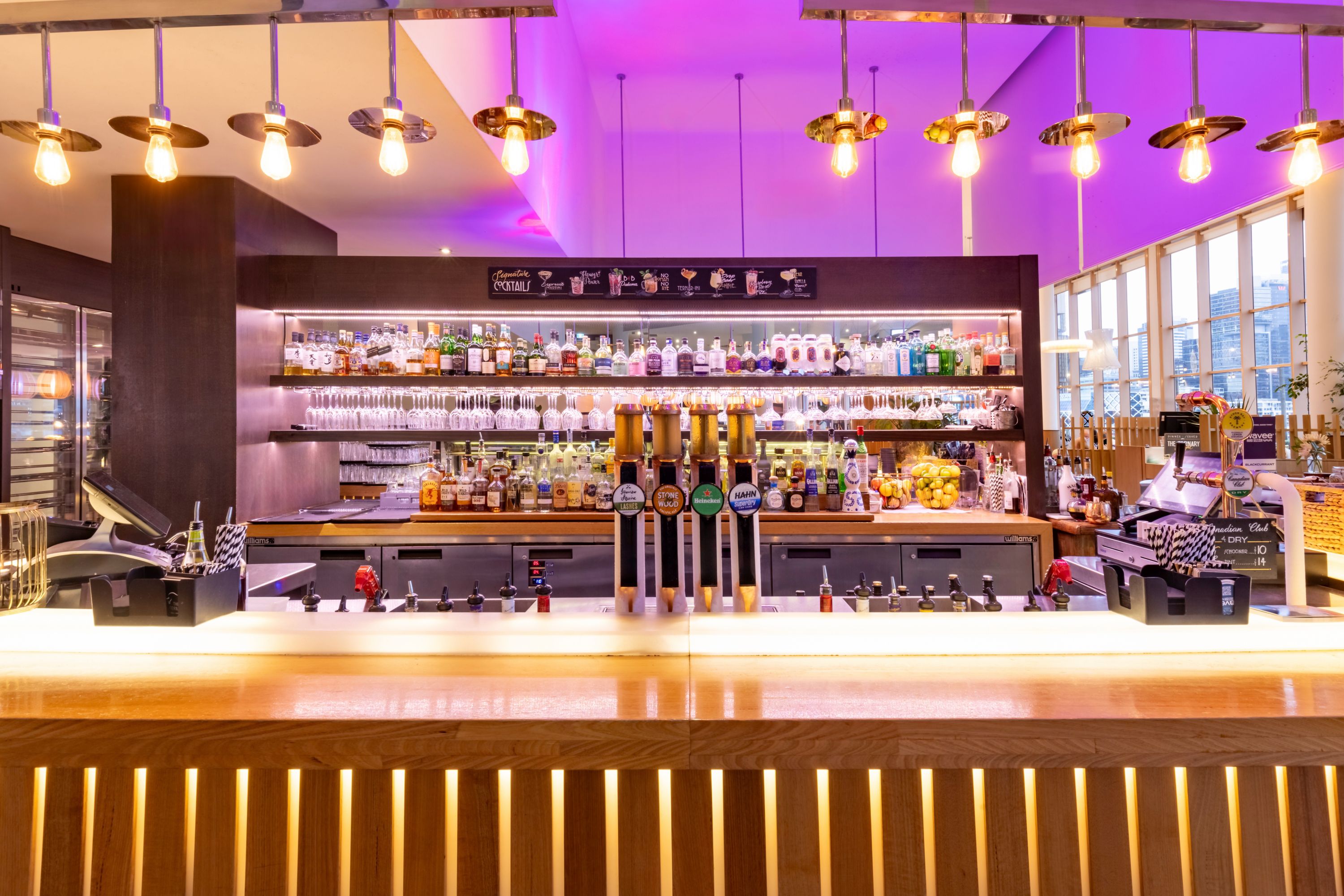 Drinking establishments don’t get much more glamorous than Champagne Bar, with its leather booths and floor-to-ceiling windows offering panoramic views over Darling Harbour and extending all the way to the city skyline. Sit back and watch the lights of the CBD begin to twinkle as the day ends. As far as Sydney bars with a view go, this one is a gem.