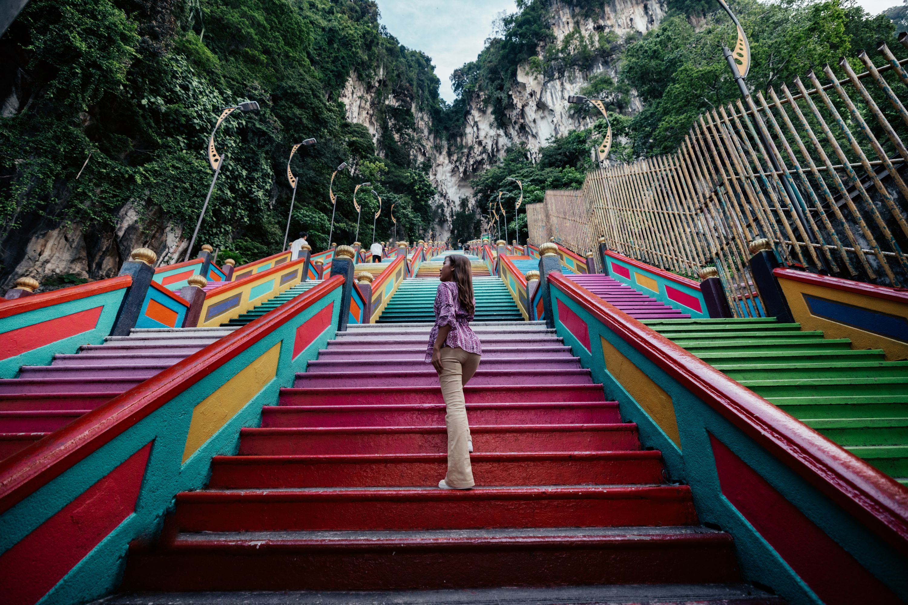 A limestone hill with sacred Hindu temples housed within its caves. Visitors are greeted by the golden statue of Lord Murugan and a colourful staircase leading to the caves.