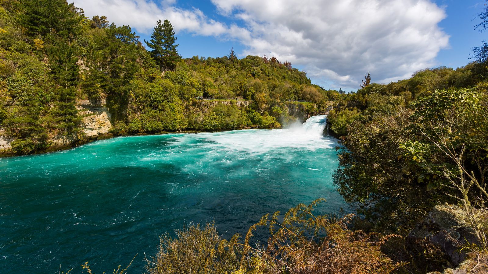 This is nature at full throttle. The Waikato River, New Zealand’s widest, is funnelled into a canyon barely 15 metres wide. In that squeeze, 220,000 litres of turquoise water rocket through every single second before plunging over Huka Falls. The force is so violent it shakes the ground, creating a constant white mist that hangs in the trees. It’s hypnotic, a reminder that geology here isn’t just background scenery, it’s alive and moving.