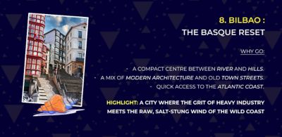 Forget the 'futuristic' labels for a second. Bilbao is basically where heavy industry and the wild Atlantic coast had a high-speed collision. You’re standing under the giant titanium scales of the Guggenheim, but the real detox is that salt-stung wind hitting you on a coastal trail just twenty minutes later. It’s a gritty, beautiful shift. You find yourself drifting into the Casco Viejo (the Old Town), and honestly, you can just ditch the maps. You’re looking for the pintxo bar with the most toothpicks on the floor—that’s the only data point that matters here.