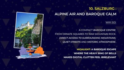 Salzburg rounds out the list, mostly because those mountains don't really care about your 5G. You’re standing in this tiny, ornate baroque square one minute, and then, boom, you’re halfway up the Monchsberg heights the next. It’s a jarring, brilliant shift. No digital clutter, just the heavy ring of bells and the wind hitting the rock. It’s a raw kind of quiet that makes a smartphone feel pretty irrelevant.