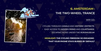 Amsterdam combines high cultural density with one of the strongest cycling infrastructures in Europe. Amsterdam only really starts to feel 'offline' once you’re on a bike, weaving through the chaos. As you cycle through the brick-vaulted tunnel under the Rijksmuseum, suddenly you’re out in the Amsterdamse Bos where the trees are thick enough to swallow the city noise. It’s this odd sort of autopilot. You’re busy enough watching for trams that the phone stays buried in your pocket, yet your brain has all this room to just... drift. Maps are useless here anyway. Every crooked alleyway seems to dump you into a mossy courtyard or a gallery entrance that’s way too tucked away for a digital feed to find. You aren't forcing a detox. You’re just too busy riding to care.