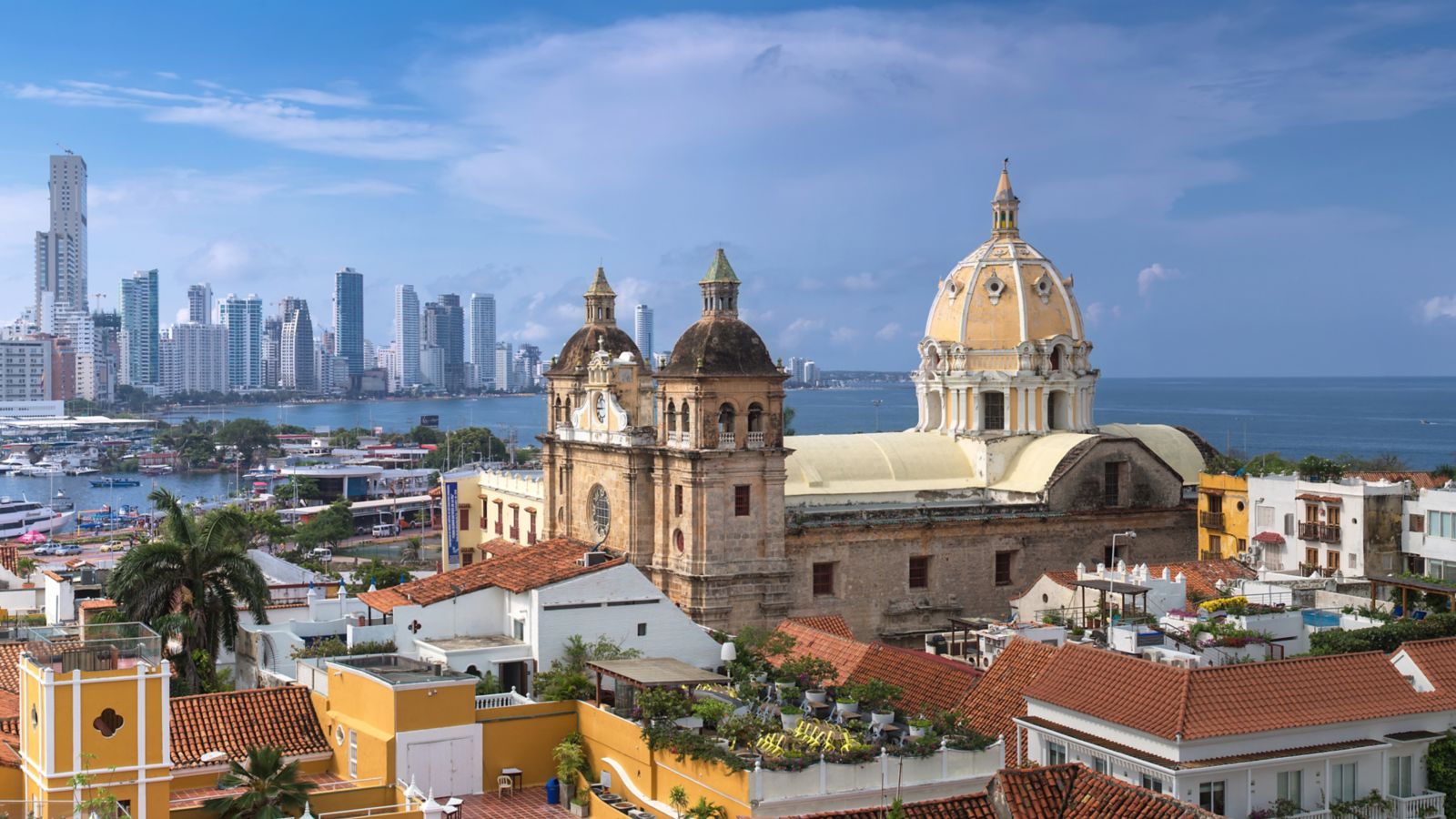 La Catedral de Cartagena de Indias, conocida oficialmente como Catedral Basílica Metropolitana de Santa Catalina de Alejandría, data del siglo XVI. Es uno de los puntos más importantes y atractivos de la ciudad por su gran valor cultural y arquitectónico. Ubicada en el centro histórico, junto al Parque de Bolívar, su gran tamaño hace que sea posible ver la cúpula y el campanario de la iglesia, de color amarillo con detalles blancos, casi desde cualquier punto de la ciudad. De cerca, se destacan sus enormes puertas de madera, columnas de piedra y pisos de mármol blanco y negro.