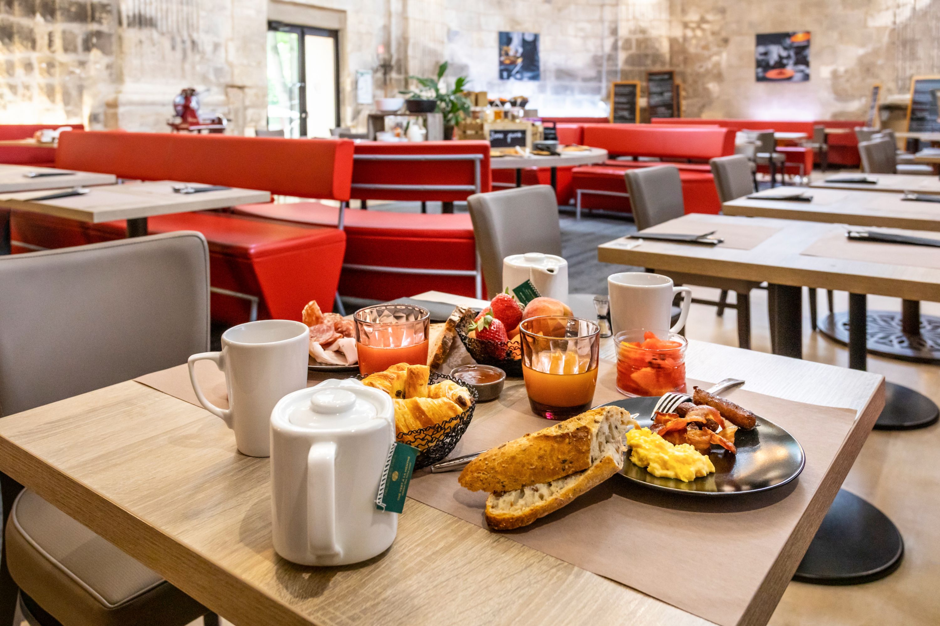 Nous comprenons vite ce qui rend l'hôtel de Bourbon Mercure Bourges si spécial. En retournant au rez-de-chaussée, nous découvrons la salle du petit déjeuner. Et quelle surprise ! Elle est aménagée dans l'ancienne chapelle de l'abbaye. Un décor atypique, presque mystique, pour apprécier les douceurs du petit déjeuner du lendemain qu'on nous promet copieux.
