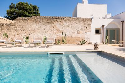 Une musique apaisante caresse nos oreilles. Un parfum subtil mais instantanément addictif flotte dans l'air. Il nous évoque les grappes de raisin mûr sur les collines italiennes, sous le soleil d'un après-midi d'été. L'hôtel est un mélange de luxe et de simplicité. Ici, tout respire l'histoire des Pouilles des murs peints à la chaux aux carreaux de ciment datant de plus de 300 ans.