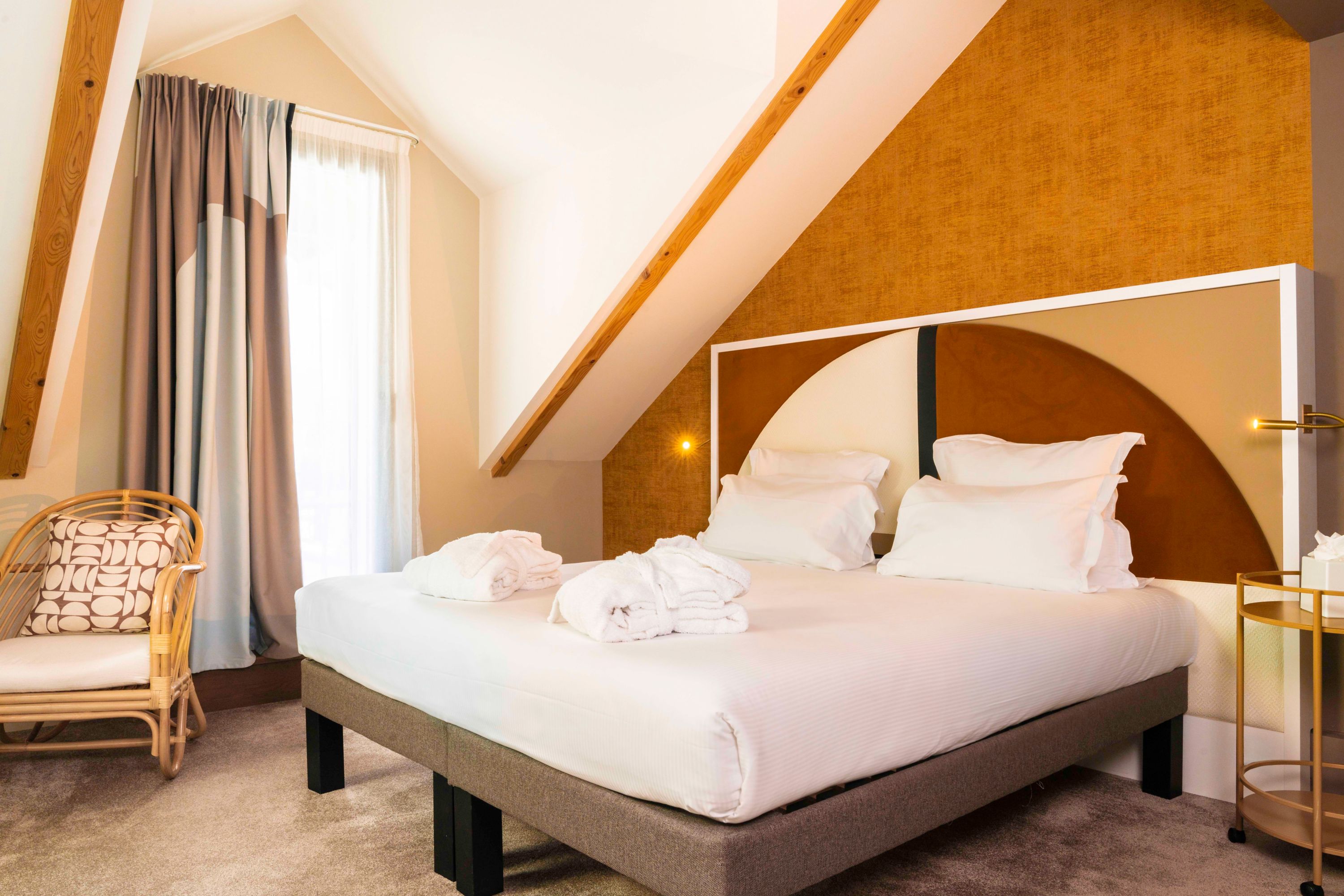 Réparties sur trois niveaux, les 75 chambres et suites du Saint Gervais Hotel & Spa font le pari du confort accessible. Les couples avec un enfant ont le canapé-lit à disposition dès la gamme classique. La déco est partout chaleureuse, avec un jeu de couleurs modernes qui n'est pas pour nous déplaire : du crème, du taupe, du doré... On sent que les efforts des designers ont été guidés par la volonté de donner un cachet raffiné aux espaces, avec des tissus et des matériaux de belle qualité.