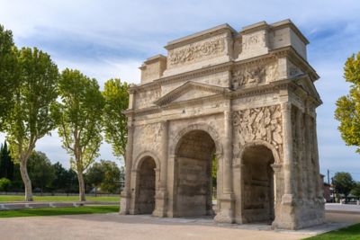 Poursuivez votre voyage dans le temps à travers les rues d'Orange. Depuis le théâtre antique, marchez vers l'avenue de l'arc de triomphe située à moins de 10 minutes à pied. En route, ne manquez pas la superbe cathédrale Notre-Dame-de-Nazareth. Son portail orné de colonnes anciennes et de bas-reliefs rend un bel hommage à l'Antiquité. Entrez pour admirer ses magnifiques peintures en trompe-l'œil. À quelques pas, l'Arc de Triomphe se dresse majestueusement face à vous. Sur près de 20 mètres de hauteur, les reliefs célèbrent les batailles épiques de la conquête de la Gaule. Un parcours sonore avec 12 stations audio vous raconte l'évolution du monument de sa construction à nos jours.