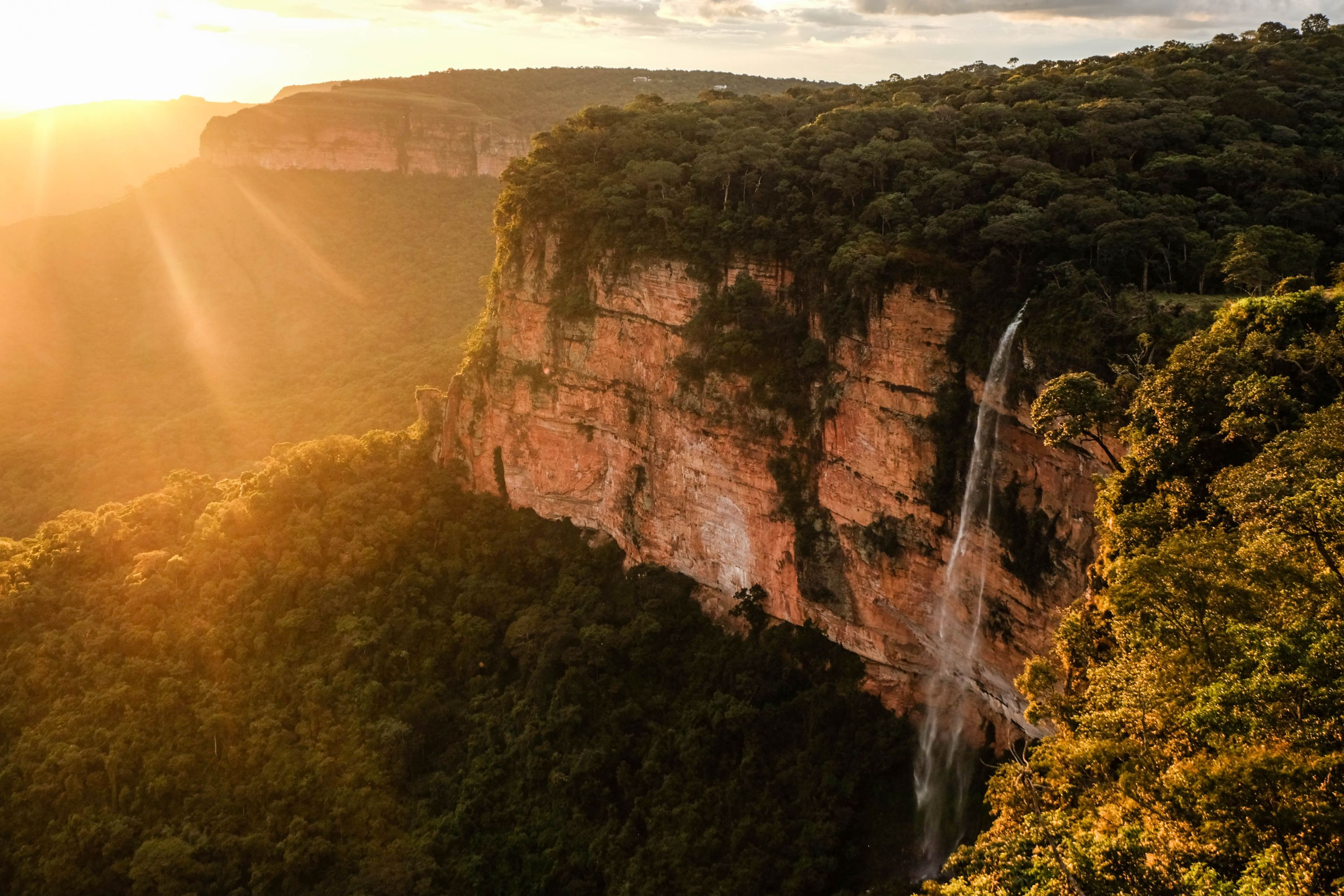Este parque, criado em 1989, é um verdadeiro santuário de biodiversidade e beleza, atraindo visitantes de todo o mundo para explorar suas paisagens e ecossistemas. Confira algumas características marcantes: Cânions e desfiladeiros: o parque é famoso por suas impressionantes formações rochosas e cânions que se estendem por toda a região. Essas formações geológicas são o resultado de milhões de anos de processos naturais e oferecem vistas espetaculares que cativam os visitantes. Cachoeiras: a marca registrada da Chapada dos Guimarães. A Cachoeira Véu de Noiva, por exemplo, é uma das mais famosas, com uma queda d'água espetacular que se projeta de um penhasco imponente. No texto mais à frente, trazemos as melhores para você visitar. Aventura: o parque oferece uma variedade de trilhas para caminhadas, desde trajetos leves até trilhas mais desafiadoras, que conduzem a paisagens espetaculares. Além disso, atividades como rapel, escalada e passeios de bicicleta também são populares entre os visitantes. Preservação e sustentabilidade: o Parque Nacional da Chapada dos Guimarães possui um papel crucial na preservação do ecossistema do Cerrado, um dos biomas mais ameaçados do Brasil. Seu status de área protegida contribui para a conservação de espécies de plantas e animais, assim como para a proteção das nascentes de rios importantes da região. Ao planejar sua visita, é importante estar preparado para caminhadas e atividades ao ar livre. Protetor solar, roupas leves, calçados adequados e água são essenciais. Além disso, respeitar as regras do parque, como não deixar lixo para trás e não perturbar a fauna, é fundamental para a preservação desse ambiente incrível.