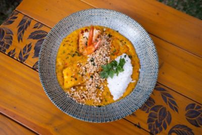 Uma combinação sofisticada de peixe grelhado e camarões ao bobó, com creme aveludado de mandioquinha, arroz de coco e farofa crocante de castanhas.