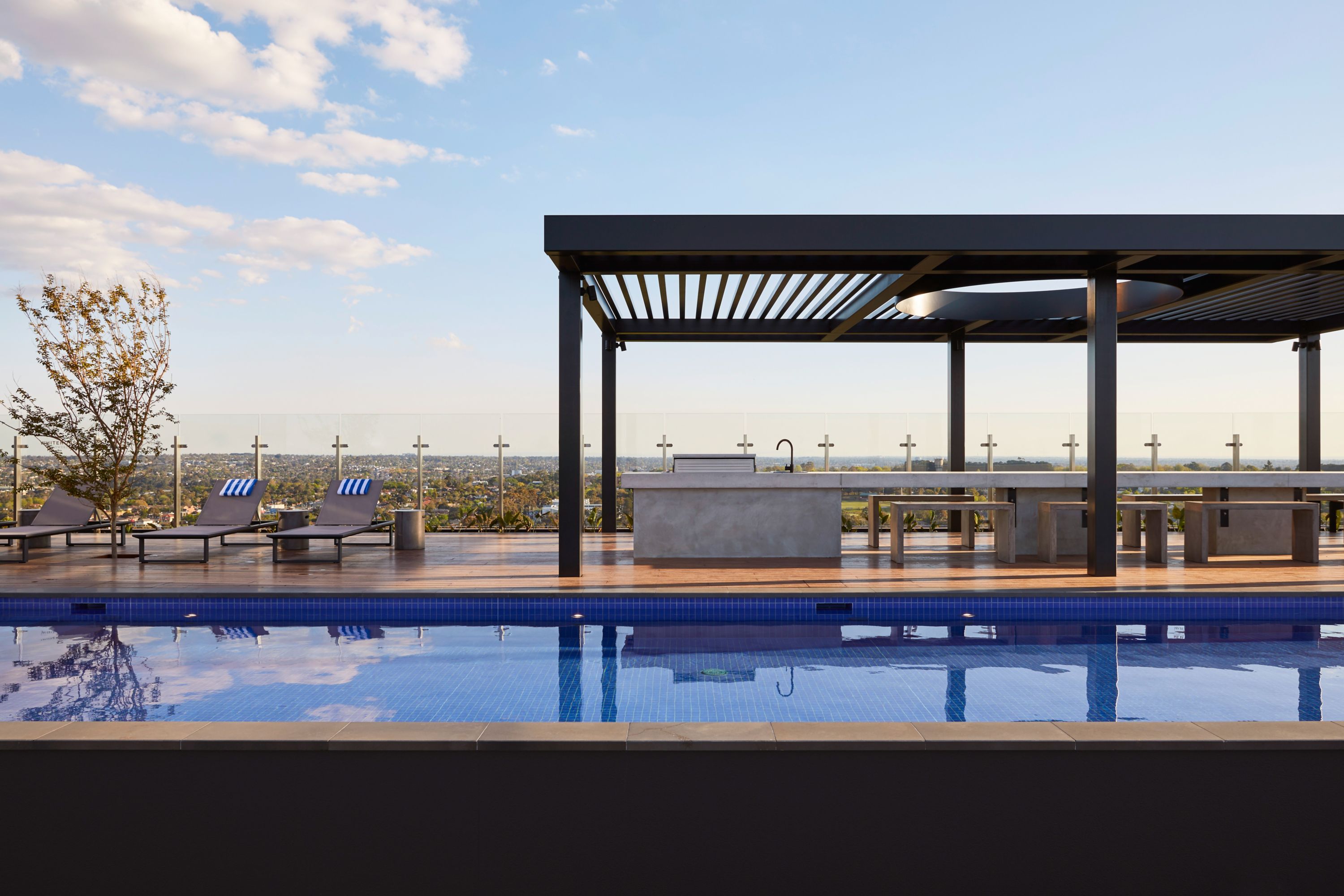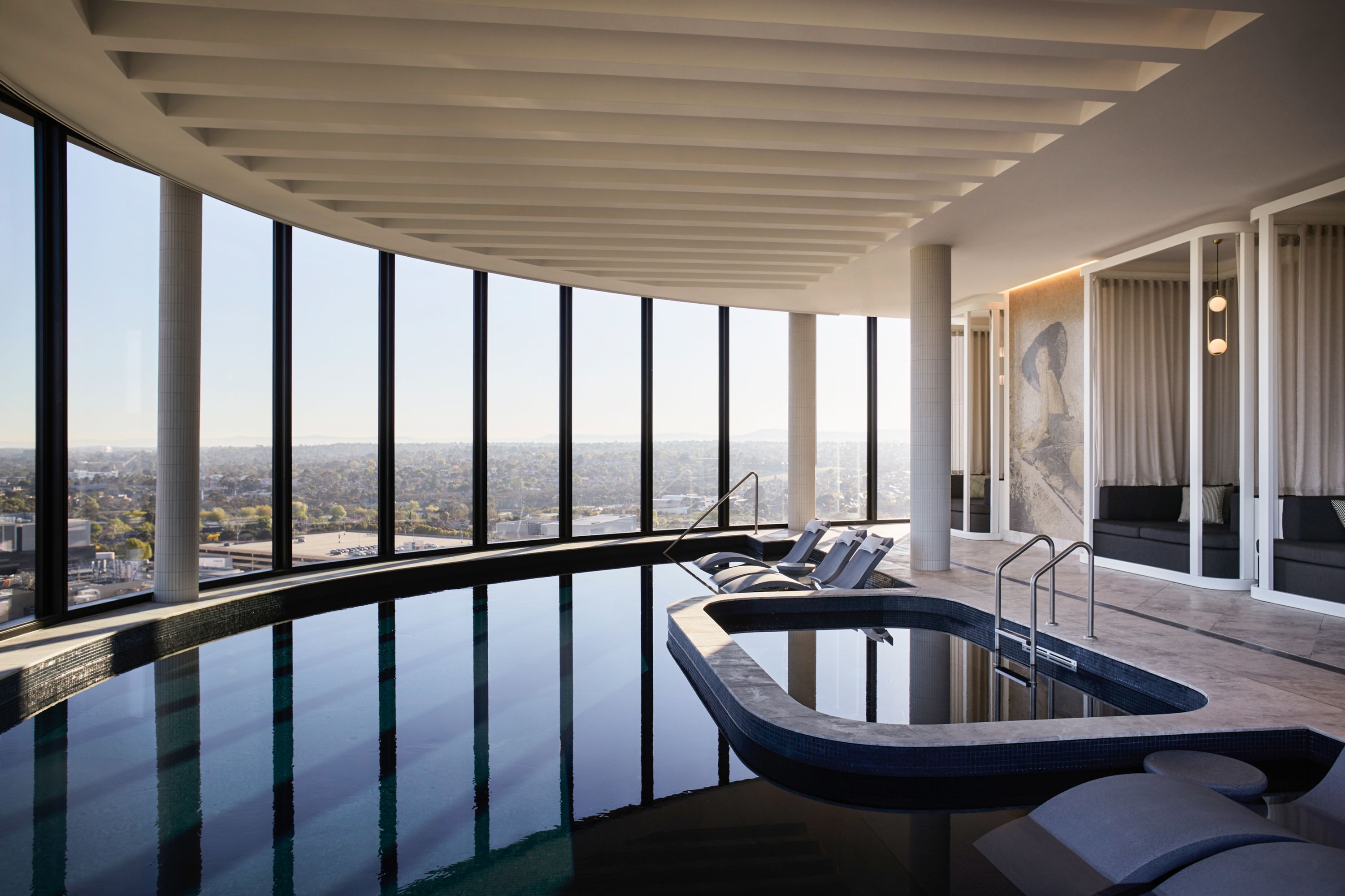Vistas ininterruptas da piscina no 24.º piso para a zona empresarial