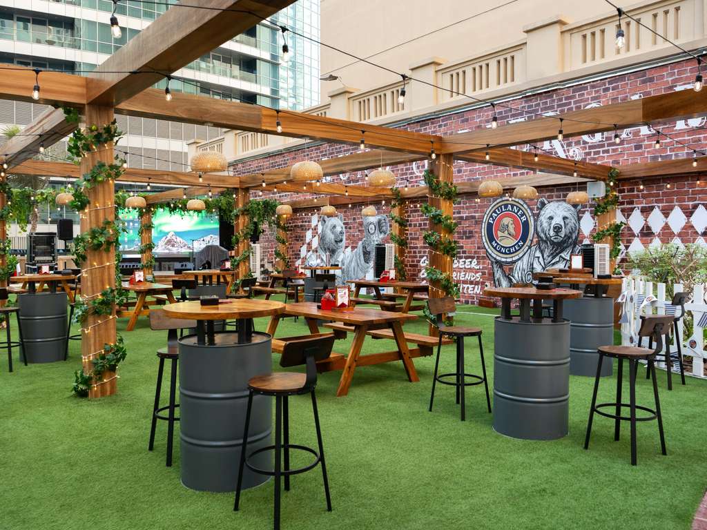Per un'esperienza nel cuore della Baviera, scoprite il nostro locale con texture alpine, una vegetazione lussureggiante, legni rustici, suggestive catene di luci, murales e un originale food truck, su una terrazza lungo la Jumeirah Beach Road.