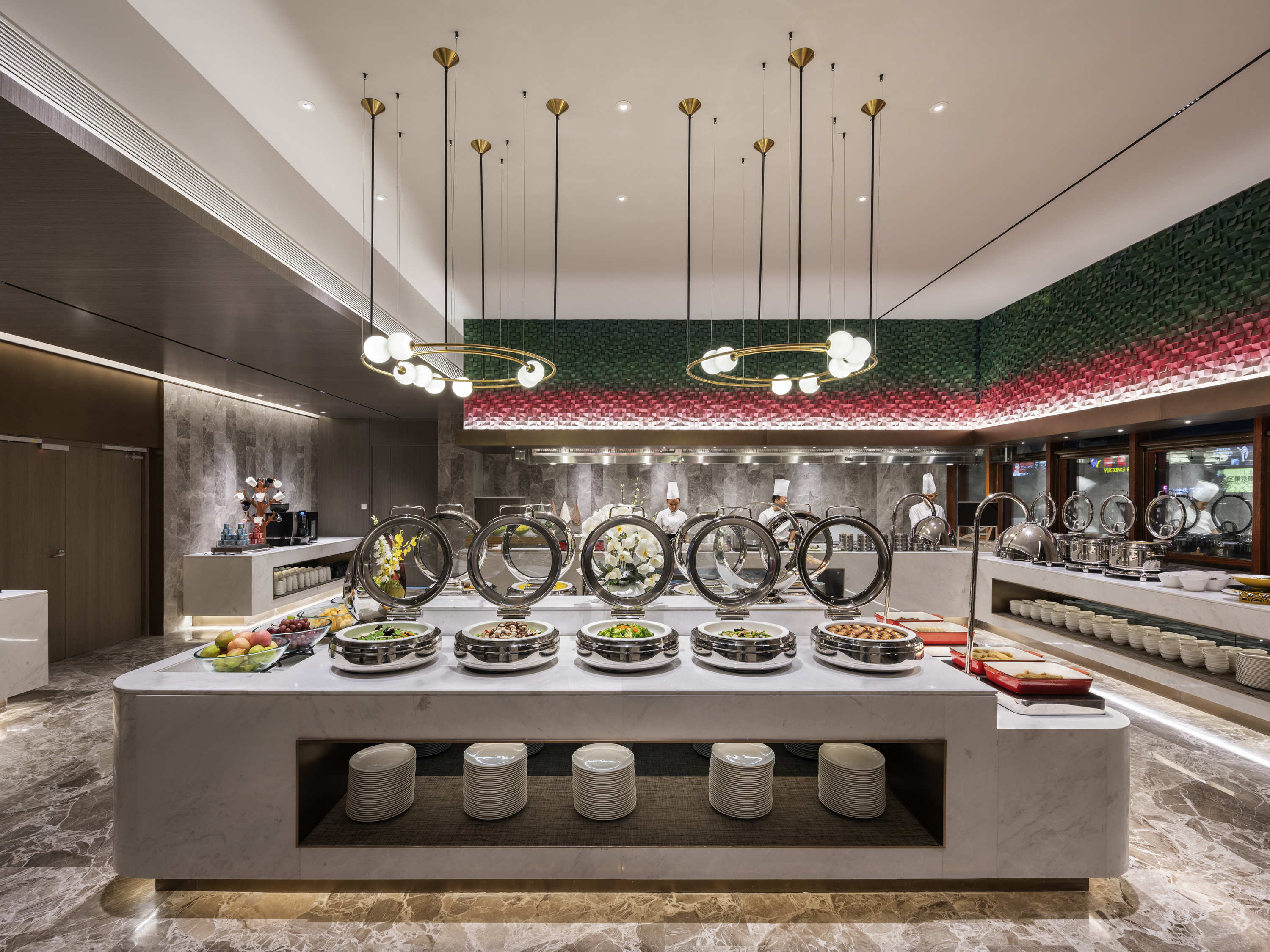 Located on the 2nd floor, the 140 seat Yishi restaurant serves international buffet for breakfast and simple noon and evening meals. It is the first choice for friends, family meals, and banquets.