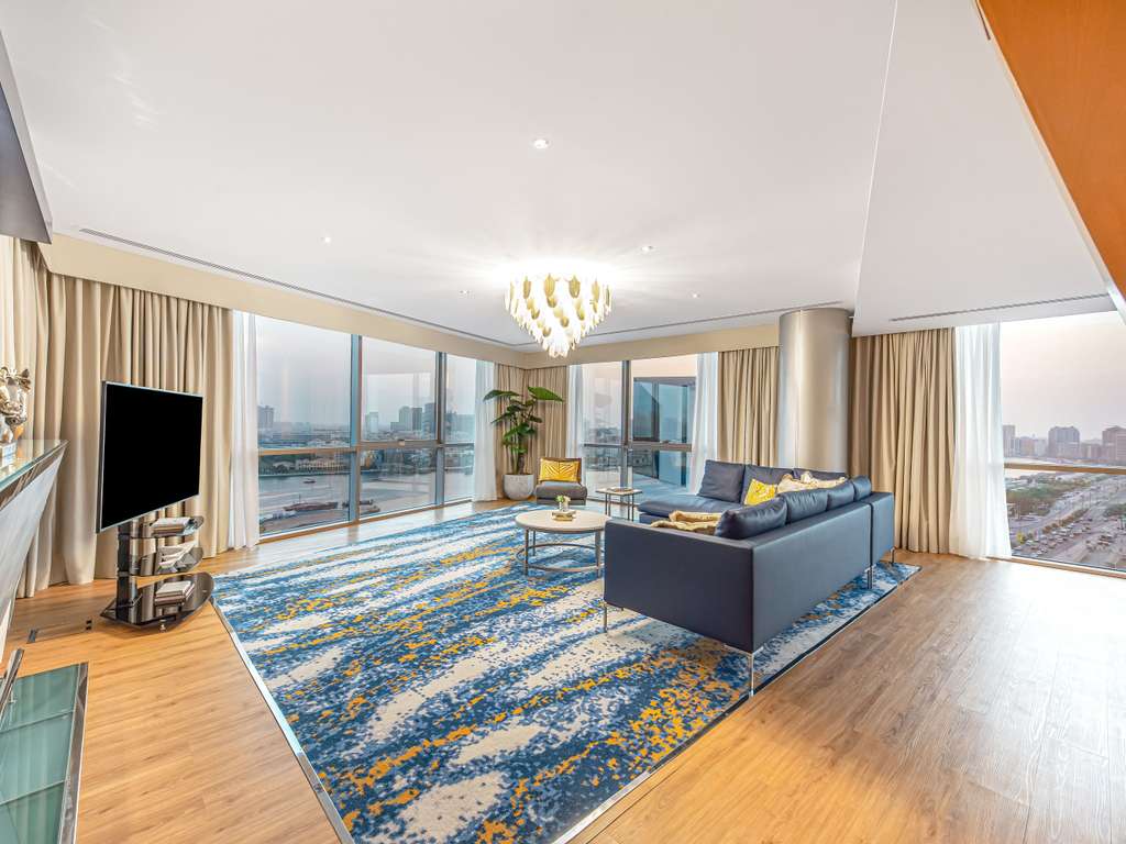 ห้องพักกว้างขวางทันสมัย พร้อมวิวพาโนรามาแบบไร้สิ่งบดบังของ Dubai Creek และเส้นขอบฟ้าเมืองดูไบ