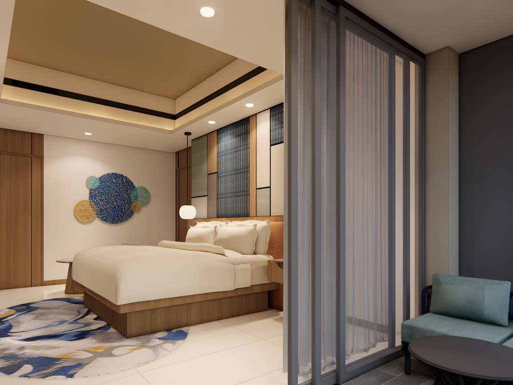 Resort aan zee met 219 kamers en suites, elk met balkon en serene zeezicht.
